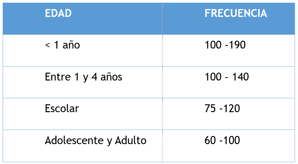 La frecuencia cardíaca es la cantidad de veces que late el corazón en un minuto, lo normal es que disminuya con la edad, los menores de un año exhiben frecuencias entre 100 y 190 por minuto, mientras que los adultos presentan frecuencias cardíacas entre 60 y 100 latidos por minuto.