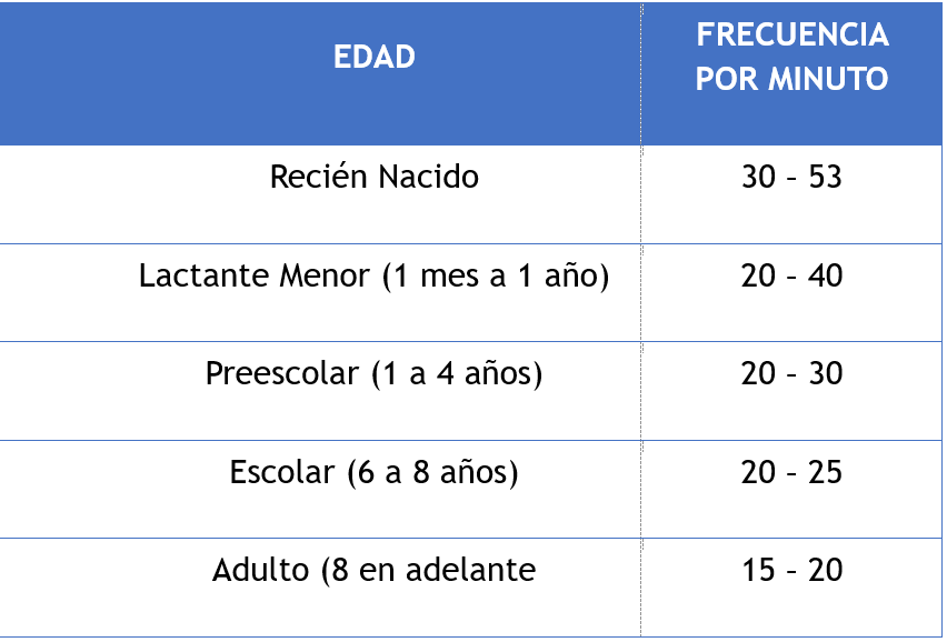 La frecuencia respiratoria se define como el número de respiraciones que realiza un ser vivo en un minuto, sus valores normales disminuyen con la edad de la persona, en la presente tabla se observan los valores normales en las distintas edades.