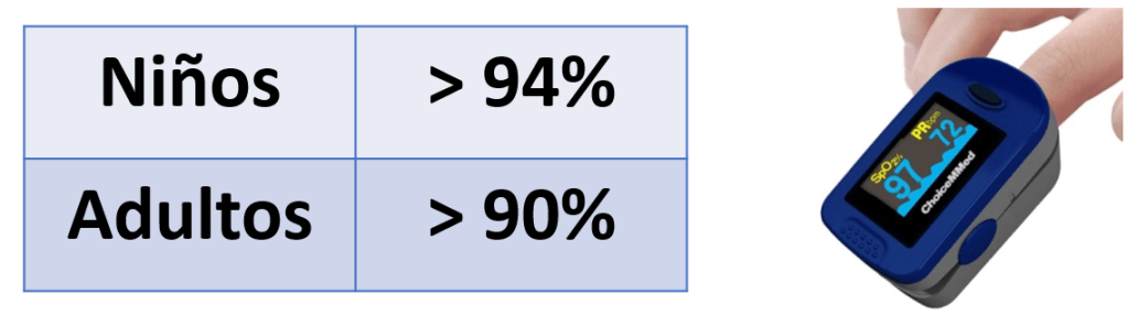 La saturación parcial de oxígeno es un método indirecto y no invasivo de medición transcutánea del porcentaje de oxígeno asociado a hemoglobina. Su valor normal es mayor a 90 en adultos y mayor a 94 en niños.