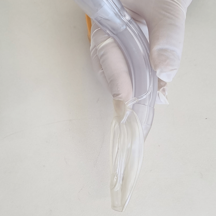 3.-Tome la máscara laríngea como un lápiz ubicando su dedo índice bajo el neumotaponador