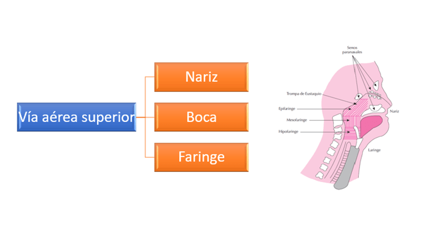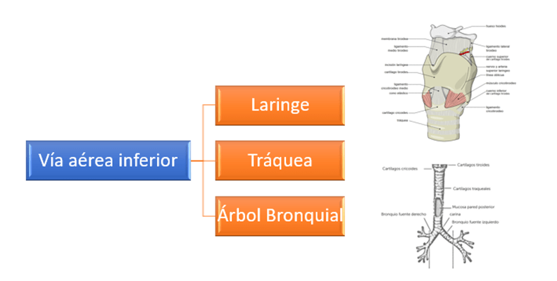 La vía aérea se puede dividir en 2; superior e inferior. La superior está conformada por la nariz, boca y faringe, mientras que la inferior se compone por la laringe, tráquea y el árbol bronquial.