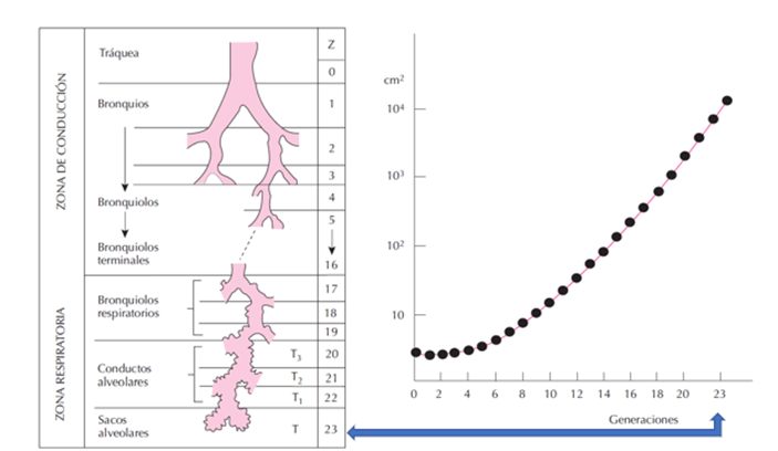 A medida que avanza el árbol bronquial el diámetro de sección transversal de las vías aéreas va aumentando, lo que enlentece el flujo aéreo en su periferia y favorece el intercambio gaseoso en la unidad respiratoria.