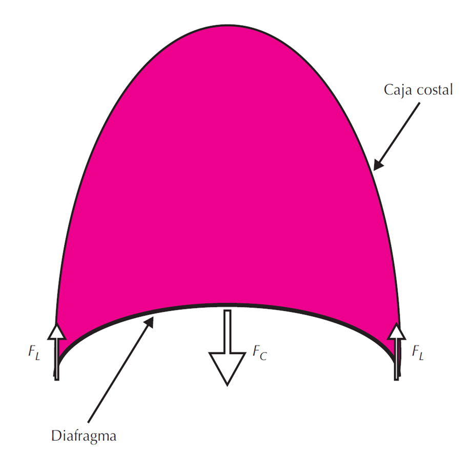 El principal musculo de la respiración es el diafragma, que al contraerse desciende, aumentando el diámetro céfalo caudal del tórax y aplicando fuerza sobre la cara superior del abdomen, la que es distribuida por sus vísceras, hacia la periferia abdominal, esto impulsa las costillas inferiores hacia arriba, aumentando el diámetro trasverso del tórax.