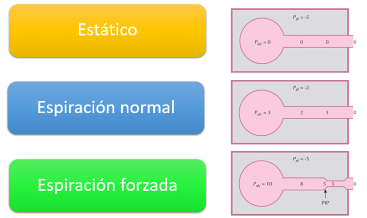 Es importante recordar que la presión alveolar en condiciones estáticas y con la boca abierta es igual a la presión atmosférica, que para efectos de la mecánica ventilatoria se le asigna el valor 0 y es generada por un equilibrio entre la presión pleural, habitualmente negativa y la presión de retracción elástica pulmonar, habitualmente positiva. Cuando el diafragma se contrae y aumenta el volumen intratorácico la presión pleural se hace más negativa, lo que hace que la presión alveolar disminuya, lo que produce el ingreso de aire a los pulmones, fenómeno llamado inspiración. Mientras que cuando el diafragma se distiende disminuye el volumen intratorácico con lo que aumenta la presión alveolar y se produce la espiración. En este proceso la presión dentro de las vías respiratorias cae paulatinamente hasta que en un punto la suma de presiones intra y extra vía aérea se hace negativa y la vía aérea se cierra por compresión dinámica, dejando retenido volumen en las vías aéreas.