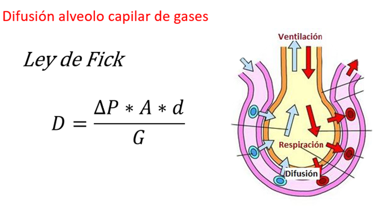 Una vez que el oxígeno se encuentra en el alveolo y el dióxido de carbono en el lecho vascular estos gases deben difundir, intercambiándose para seguir sus recorridos. La ley de Fick explica este fenómeno, ella indica que la capacidad de difundir de un gas es directamente proporcional a la diferencia de presiones, el área de intercambio y al cociente de difusión e inversamente proporcional al grosor de la membrana. El dióxido de carbono posee un cociente de difusión 21 veces mayor que el oxígeno, por lo tanto, el valor de este gas es prácticamente igual en el capilar que en el aire exhalado, en cambio se estima que en condiciones normales difunde solo el 90% del oxígeno alveolar hacia el lecho capilar.