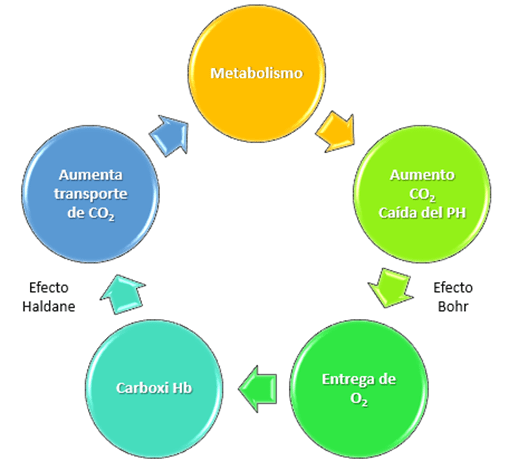 En reposo los tejidos usan un 25% del oxígeno, algunas situaciones disminuyen la afinidad del oxígeno con la hemoglobina, lo que aumenta su entrega, por ejemplo, la acidosis y la hipertermia, este fenómeno es conocido como fenómeno de Bohr. Cuando la hemoglobina pierde oxígeno es llamada Carboxi hemoglobina, esto aumenta su afinidad con el dióxido de carbono, aumentando su transporte para ser eliminado por las vías respiratorias, este es el fenómeno de Haldane.