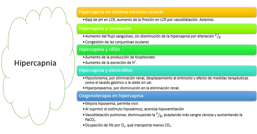 Otro mecanismo fisiopatológico que explica varias enfermedades del aparato respiratorio es el aumento de dióxido de carbono en sangre, esto es llamado Hipercapnia. Los efectos del exceso de dióxido de carbono varían según el órgano afectado. En el cerebro produce vasodilatación y aumento de la presión y baja de pH del líquido cefalorraquídeo, lo que produce debilidad de la musculatura extensora, que se traduce clínicamente en asterixis.