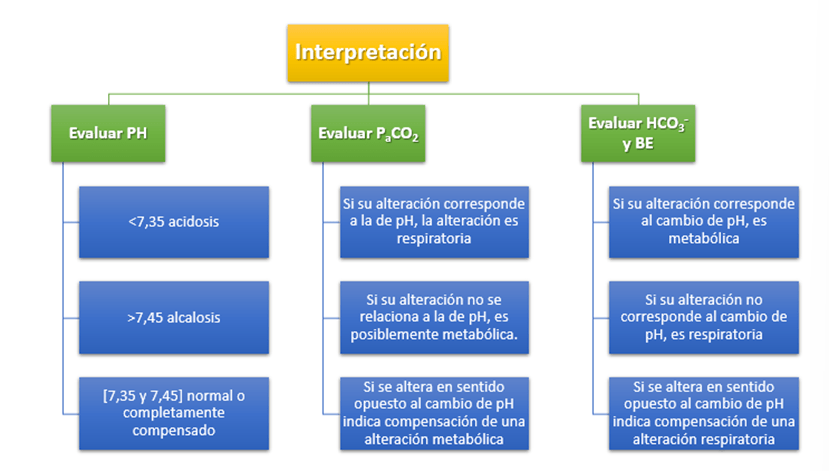 Para determinar el tipo de alteración ácido base que afecta a nuestros pacientes debemos interpretar los gases arteriales. El primer valor para su interpretación será el pH, de este deduciremos si el paciente se afecta por una acidosis o alcalosis. Para diferenciar entre respiratoria o metabólica, miraremos primero la presión arterial de dióxido de carbono, si su valor explica la alteración del pH, diremos que es una acidosis respiratoria. Si la alteración del pH no se explica por cambios en la presión arterial de dióxido de carbono, pasaremos a mirar la concentración de bicarbonato y el exceso de base. Si la alteración del pH es explicada por cambios en los valores normales de bicarbonato o en el exceso de base, la alteración será de tipo metabólica. Finalmente, si el parámetro que no explica la alteración del pH se encuentra alterado, diremos que los mecanismos compensatorios están funcionando. Estos mecanismos pueden incluso llevar el pH a valores normales.
