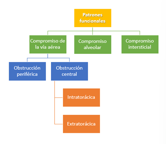 Las patologías del aparato respiratorio pueden presentarse de distintas maneras, según las estructuras que se encuentren dañadas pueden dividirse en tres patrones funcionales; Compromiso de la vía aérea, que pueden dividirse en periféricas o centrales, las que pueden ser intra o extratorácicas, compromiso alveolar y compromiso intersticial.