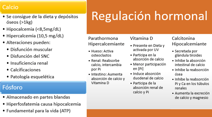 La regulación hormonal de las concentraciones de calcio y fósforo depende de tres ligandos, Parathormona, calcitonina y vitamina D.