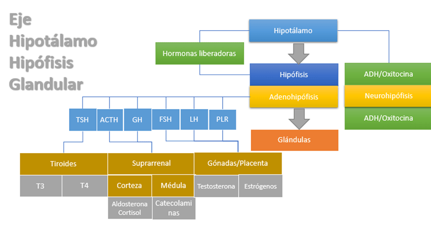 Todos los ejes endocrinos poseen como factor común la regulación hipotalámica e hipofisiaria. El hipotálamo produce dos neurohormonas, la antidiurética (ADH) y la oxitocina, estas viajan por vía axonal hasta la hipófisis posterior, llamada neuro hipófisis, que las libera directamente al torrente sanguíneo, generando su acción en los órganos diana sin mediar otras glándulas.