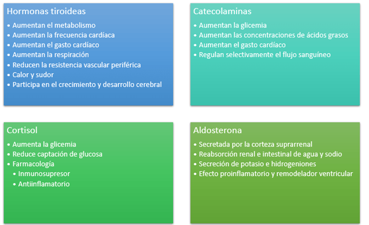 Las catecolaminas son el principal neurotransmisor efector del sistema nervioso simpático y desde el punto de vista hormonal sus acciones son aumentar la glicemia, aumentan las concentraciones de ácidos grasos libres, aumentan el gasto cardíaco y redistribuir el flujo sanguíneo hacia el músculo esquelético y los órganos vitales, entre muchas otras funciones detalladas en el capítulo de neurofisiología.