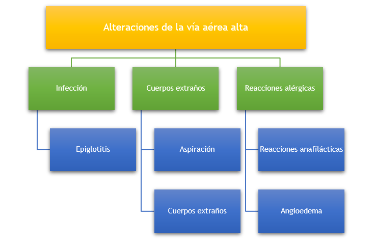 Las alteraciones de la vía aérea alta que comprometen la vida pueden ser divididos en tres grupos, las infecciosas, por cuerpos extraños a la vía aérea y las reacciones alérgicas. Las alteraciones por cuerpo extraño serán atendidas en la unidad de soporte vital básico.