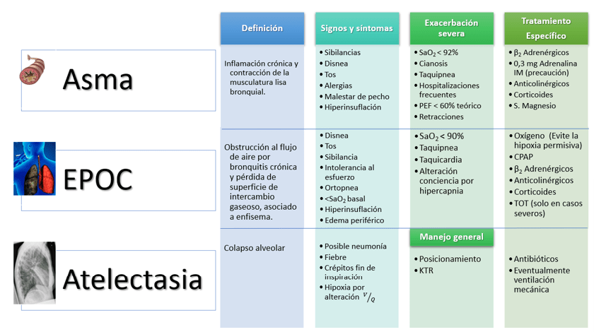 El asma se define como una inflamación crónica, asociada a contracción de la musculatura lisa de bronquios y bronquiolos, suele comenzar antes de los 5 años. Fisiopatológicamente disminuye el lumen de las vías aéreas, incrementando la resistencia al paso de aire y el espacio muerto anatómico, lo que disminuye la ventilación alveolar y genera un silbido al paso de aire, llamado sibilancia, en casos iniciales esto ocurre solo en espiración, sin embargo, al aumentar la gravedad las sibilancias ocurren en ambos tiempos y son audibles sin fonendo, en los casos más severos el murmullo pulmonar no es audible, debido al escaso movimiento de aire. La disminución de la ventilación alveolar puede compensarse a través de un aumento en la frecuencia respiratoria. Cuando los mecanismos compensatorios fallan puede producirse hipoxemia e hipoxia. Es común que el motivo del asma es una reacción alérgica de las vías aéreas, que comienza con inflamación y broncoespasmo, continúa con producción excesiva de moco, lo que puede complicarse con la formación de atelectasias.