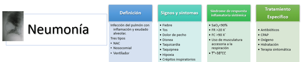 La neumonía es la infección de las estructuras pulmonares, la respuesta inflamatoria a la infección genera disnea, tos productiva y dolor torácico. Existen tres tipos de neumonía, adquirida en la comunidad (NAC), nosocomial, que es adquirida en un recinto hospitalario y asociada a la ventilación mecánica, desde el punto de vista etiológico puede ser, bacteriana, viral, fúngica o química.