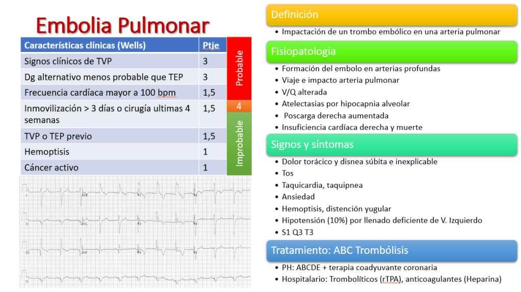 El diagnóstico del tromboembolismo pulmonar puede orientarse con el puntaje de Wells que asigna 3 puntos si el paciente posee signos clínicos de trombosis venosa profunda, 3 si posee un diagnóstico alternativo menos probable que TEP, 1,5 si presenta taquicardia, 1,5 si ha estado inmovilizado durante las últimas 4 semanas, 1,5 si ha padecido anteriormente TVP o TEP, 1 si presenta hemoptisis y 1 si presenta cáncer activo. Cuando el puntaje de Wells es mayor a 7 puntos el riesgo de TEP es elevado, entre 2 y 6 puntos el riesgo es moderado y de 0 a 1 punto el riesgo es bajo. Ante la sospecha diagnóstica sobre 4 puntos es probable que el cuadro clínico corresponda a un TEP, bajo eso es improbable