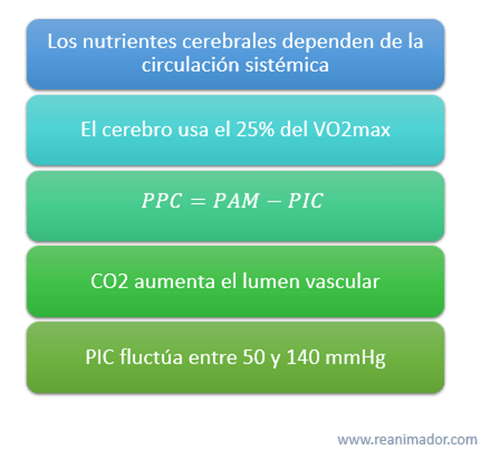 El cerebro es un órgano altamente irrigado, ya que no es capaz de almacenar sus nutrientes, por lo tanto es dependiente de la glucosa y el oxígeno provenientes de la circulación sistémica, tanto así que ocupa el 25% del consumo máximo de oxígeno. Para recibir esa cantidad de sangre la presión arterial sistémica y la presión intracraneana deben estar en equilibrio, esto para mantener una adecuada presión de perfusión cerebral. En términos matemáticos la presión de perfusión cerebral es igual a la presión arterial media, menos la presión intracraneana. La Presión intracraneana depende del lumen de sus arterias, el que aumenta en presencia de dióxido de carbono y disminuye en su ausencia, y sus valores normales fluctúan entre 50 y 140 mmHg. Cuando ocurren cambios en la presión sistémica o en la presión intracraneana, que no logran ser compensados, la presión de perfusión cerebral se verá afectada.