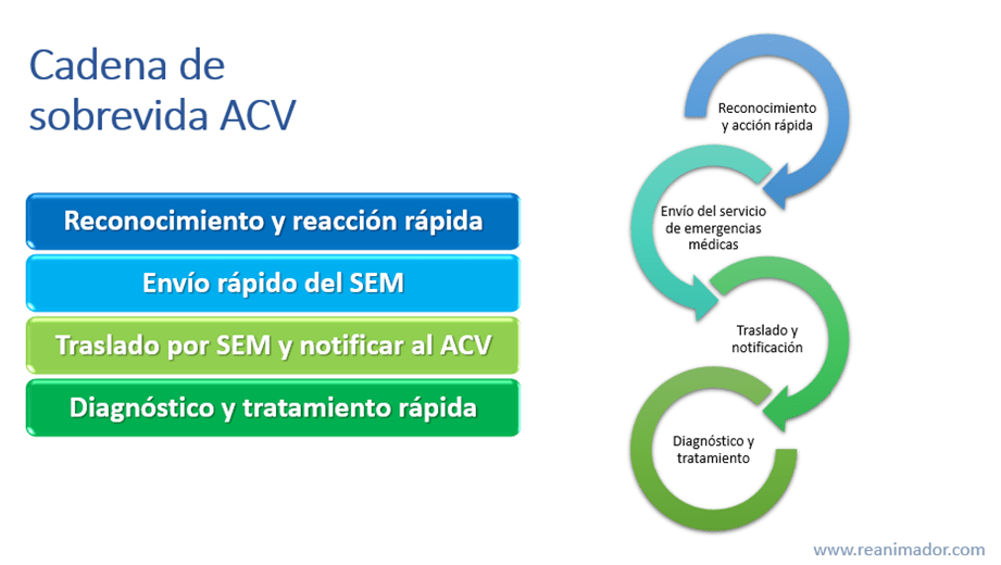 Al igual que para el paro cardiorrespiratorio, la sociedad americana del corazón acuñó la nemotecnia llamada cadena de sobrevida, que muestra los eventos que deben ocurrir para que la víctima de un accidente cerebro vascular logre sobrevivir sin secuelas. El primer eslabón de la cadena es el reconocimiento y reacción rápida, es importante que la población general sepa identificar rápidamente la enfermedad para pasar al siguiente eslabón que es el envío rápido del Servicio de Emergencias Médicas, en Chile corresponde al SAMU, que se activa llamando al número 131. El tercer eslabón de la cadena es el traslado rápido en ambulancia y la notificación al centro receptor, que debe contar con la capacidad técnica para recibir a este paciente. El último eslabón de la cadena de sobrevida del ACV es el diagnóstico y tratamiento rápido en el servicio de urgencia.