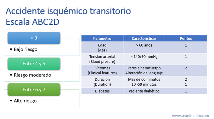El accidente isquémico transitorio, es un tipo especial de accidente cerebro vascular, su origen es habitualmente trombótico y presenta los mismos síntomas que veremos más adelante, pero estos son de remisión espontánea en el transcurso de minutos a horas. Para determinar la probabilidad de sufrir un accidente cerebro vascular 48 horas posterior a un accidente isquémico transitorio se utiliza la escala ABCD2, cuyos puntajes fluctúan entre 0 y 7 puntos. Cuando la edad del paciente es mayor a 60 años suma 1 punto, cuando la presión arterial es superior a 140/90 en la primera medición tras el accidente isquémico transitorio, se agrega 1 punto, al presentar alteración del lenguaje sin déficit motor, se adiciona 1 punto, sin embargo, cuando se suma déficit motor, se adicionan 2 puntos. Otro factor importante es la duración del accidente isquémico transitorio, si es mayor a 60 minutos, suma 2 puntos y si duró más de 10 minutos, pero menos de 60, suma 1 punto, finalmente si es diabético se agrega 1 punto.