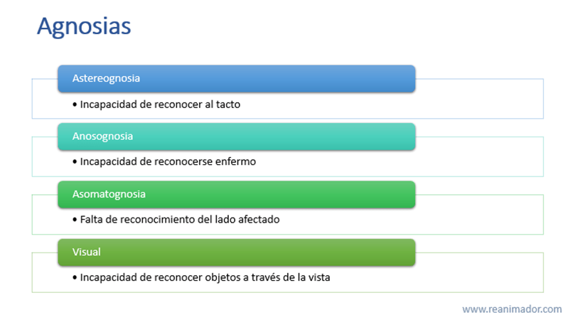 - Anosognosia: Pérdida del conocimiento del propio estado físico o cognoscitivo. El paciente será incapaz de reconocer que está enfermo, incluso con síntomas tan claros como la hemiplejia.