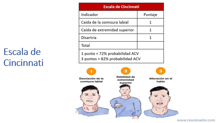 La escala de Cincinnati posee 3 puntos. El primero es la caída de la comisura labial, solicite al paciente que sonría y evalúe ambas comisuras labiales. El segundo es la incapacidad de mantener una extremidad superior contra la gravedad, lleve los hombros del paciente a 90 grados de flexión con los codos extendidos y las manos supinas, evalúe la capacidad de mantenerlas en esa posición durante 5 segundos. Finalmente la disartria o dificultad para hablar, converse con el paciente y evalúe su forma de hablar, consulte con sus familiares si notan diferencias. Con la presencia de 1 punto en la evaluación del paciente, la certeza de padecer un accidente cerebro vascular es de un 72%. Con 3 puntos la probabilidad sube a 82%.