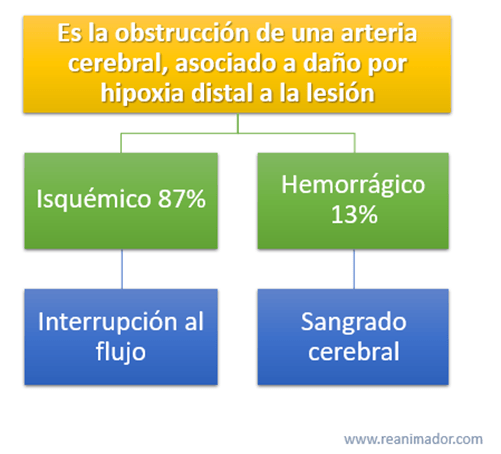 Se define como accidente cerebro vascular a la obstrucción de una arteria cerebral, asociado a daño por hipoxia distal a la lesión, en la mayoría de los casos es de tipo embólico, es decir un trombo viaja desde la circulación periférica, o se produce en el corazón y se impacta en una arteria cerebral. En el 87% de los casos es isquémico, cuando hay hipoxia por obstrucción del flujo sanguíneo, pero sin sangrado, o hemorrágico, cuando ocurre sangrado, esto ocurre en el 13% de los casos.