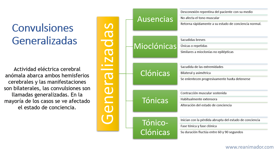 Cuando la actividad eléctrica cerebral anómala abarca ambos hemisferios cerebrales y las manifestaciones son bilaterales, las convulsiones son llamadas generalizadas. En la mayoría de los casos se ve afectado el estado de conciencia. Existen muchos tipos de convulsiones generalizadas.