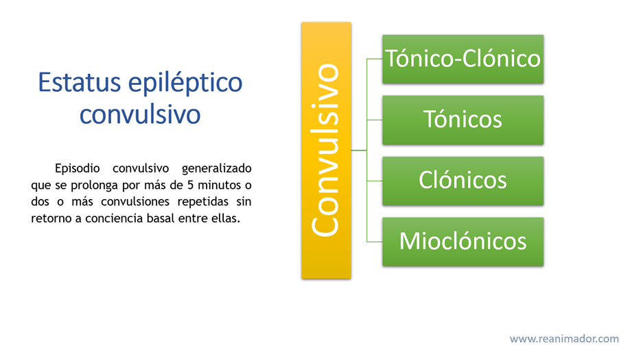 El estatus epiléptico convulsivo generalizado se define como un episodio convulsivo generalizado que se prolonga por más de 5 minutos o dos o más convulsiones repetidas sin retorno a conciencia basal entre ellas. Pueden ser tónico-clónicas, tónicas, clónicas, mioclónicas. Estas ya fueron explicadas