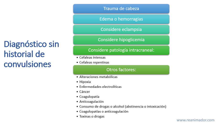 En pacientes sin historial el diagnóstico es más complicado debido a la gran variedad de males que causan convulsiones, entre las que encontramos, trauma de cabeza, edema o hemorragias, eclampsia, hipoglicemia, patologías intracraneales, estas habitualmente se presentan con cefalea intensa y repentina, y otros factores como: alteraciones metabólicas, hipoxia, tumores, coagulopatías, intoxicaciones, entre otras.