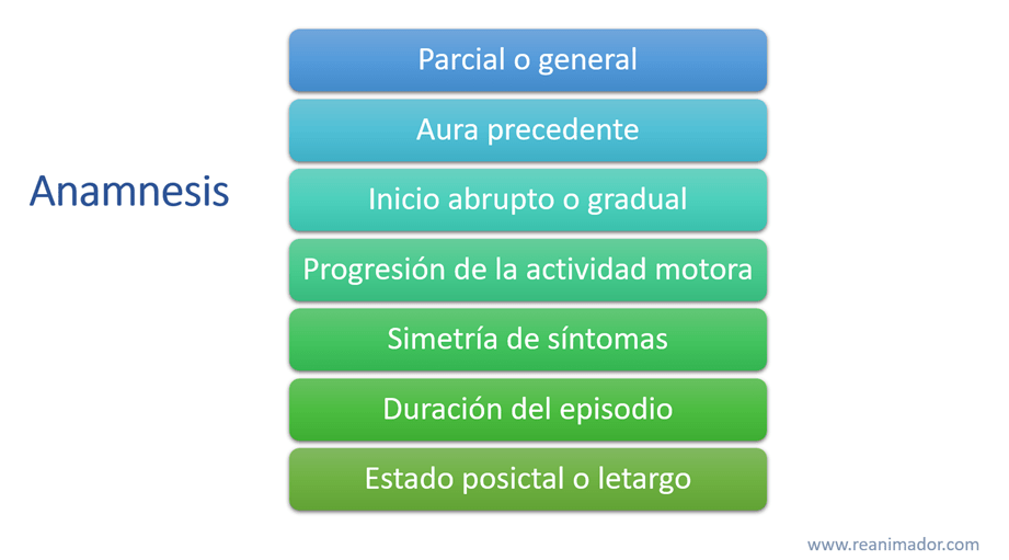 En la atención prehospitalaria la anamnesis es muy importante, puesto que, a diferencia que en medio intrahospitalario, los evaluadores cuentan con menos herramientas diagnósticas. En términos generales la anamnesis debe enfocarse en el tipo de convulsión, la presencia de aura, si fue de inicio abrupto o gradual, si hubo progresión de la actividad motora, si los movimientos fueron simétricos, en la duración del episodio y en la presencia de estado post ictal, caracterizado por letargo, hipertensión y taquicardia posterior a la convulsión.