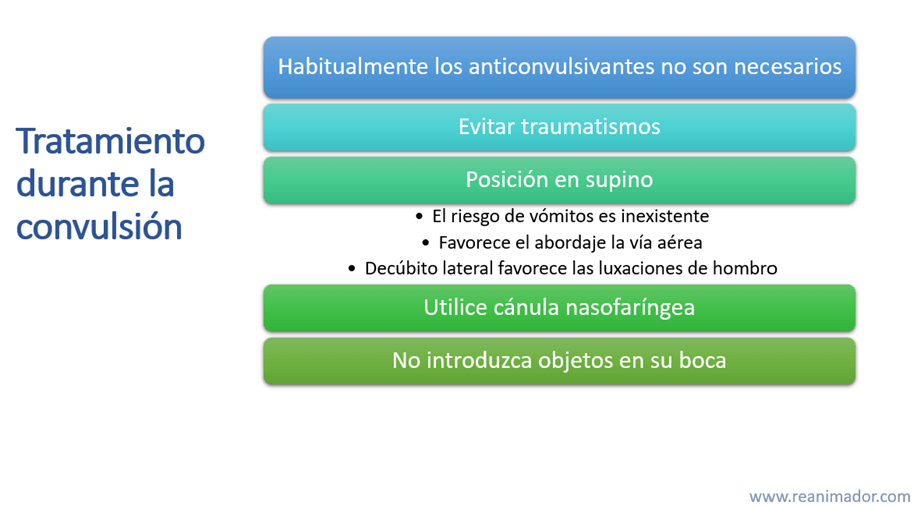 Durante el período crítico los tratantes deben evitar traumatismos y mantener al paciente en posición supina. Se ha observado que el riesgo de aspiración durante la convulsión es mínimo y que la posición en decúbito lateral incrementa el riesgo de luxación de hombro, además la posición supina permite un mejor acceso a la vía aérea, para esto privilegie el uso de cánula nasofaríngea. El uso de dispositivos orales se encuentra contraindicado.