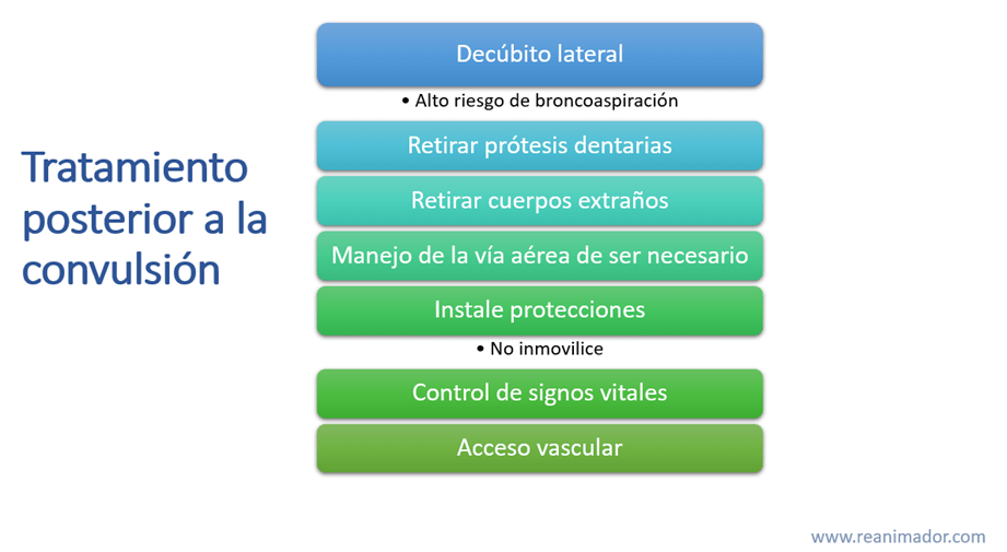 Una vez terminada la convulsión comienza el período poscrítico, durante este período existe un alto riesgo de aspiración, por lo que el paciente debe ser posicionado en decúbito lateral, además deben retirar cuerpos extraños, incluidas las prótesis dentales.