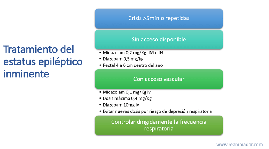 Las benzodiazepinas de elección en el campo prehospitalario son midazolam y diazepam. La dosis de midazolam por vía rectal, intramuscular o nasal es de 0,2 miligramos por kilo de peso corporal, mientras que la de diazepam es de 0,5 miligramos por kilo de peso corporal.
