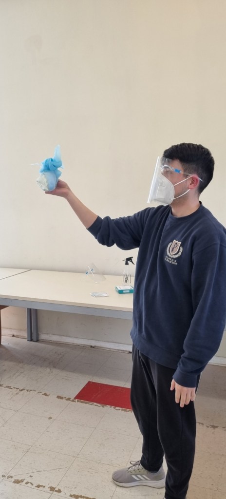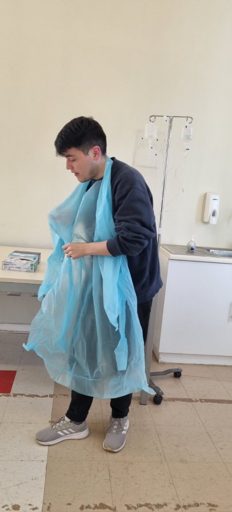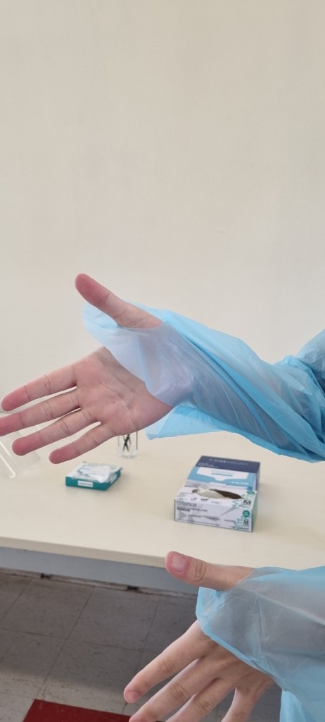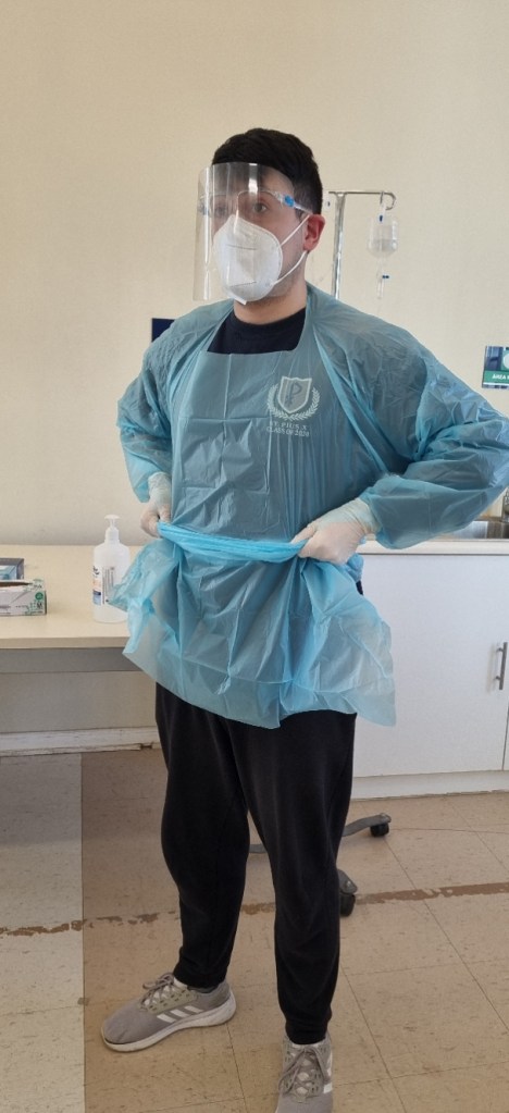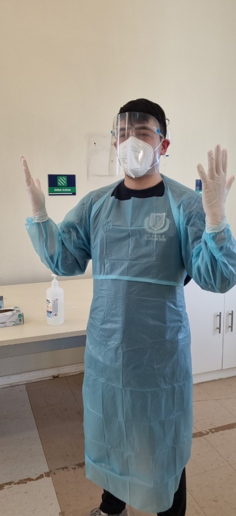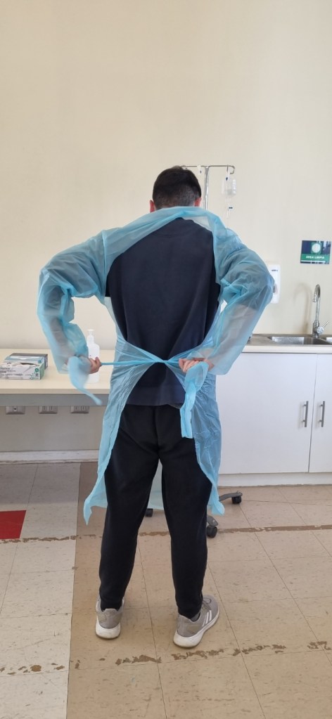 1.- Retire la pechera la traccionándola, sin tocar la zonas contaminadas con las no contaminadas