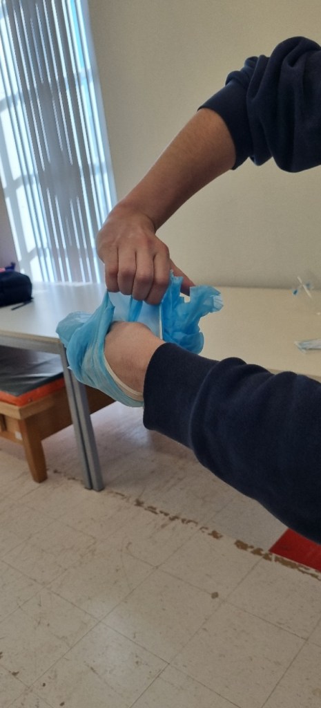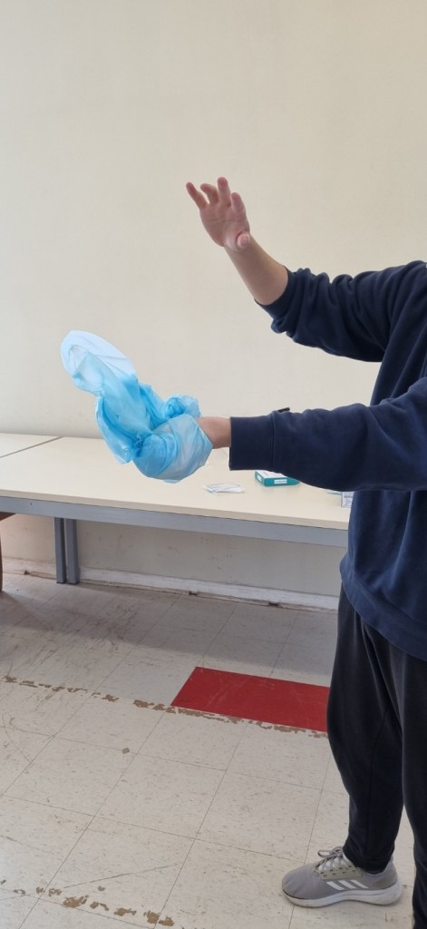 3.- Retire un de los guantes mientras acumula la pechera y el guante en la otra mano