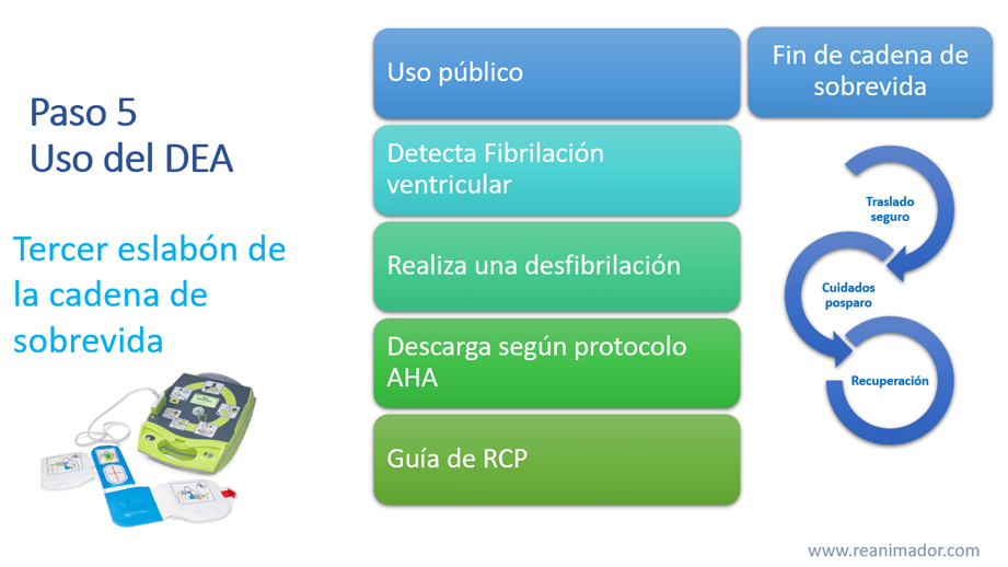 - Uso del desfibrilador externo automático (DEA). El DEA es un dispositivo de uso público y sencillo diseñado para detectar la fibrilación ventricular, recomendar y suministrar una descarga eléctrica para revertir dicha situación, lo hace según los protocolos internacionales establecidos por la sociedad americana del corazón. Además, es capaz de entregar retroalimentación para realizar una reanimación cardiopulmonar de calidad. Este procedimiento completa el tercer eslabón de la cadena de sobrevida.