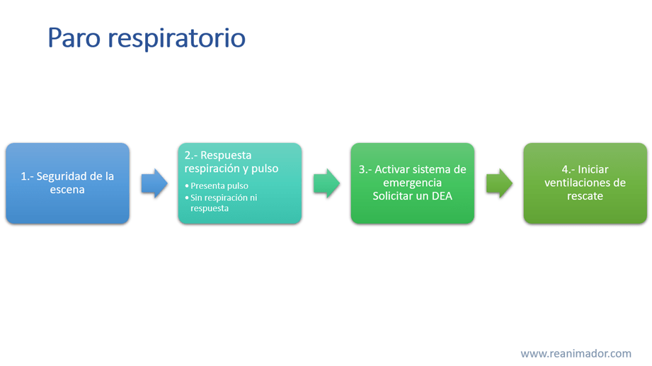 Otra circunstancia de riesgo vital que debe ser corregida con premura es el paro respiratorio, que consiste en la detención de la respiración cuando el corazón sigue latiendo. Esta condición no dura más de un par de minutos, por lo que es importante actuar rápido. En esta situación el paciente no respira, no responde, pero si tiene pulso carotídeo.