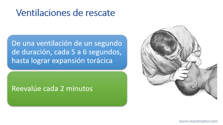 Las ventilaciones de rescate deben ser cada 5 a 6 segundos, estas son boca a boca, o con dispositivo bolsa mascarilla, deben durar un segundo, obtener expansión torácica y, dentro de lo posible, deben ser realizadas con un dispositivo de barrera o con un dispositivo bolsa mascarilla cuando se cuenta con personal entrenado. El paciente se reevaluará cada dos minutos.