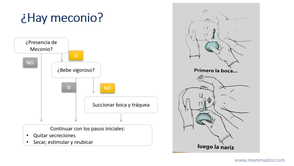 Una condición particular ocurre cuando el feto viene cubierto en meconio, o heces del neonato, en ese caso debe observar si el paciente está o no vigoroso, de ser así continuaremos con los pasos iniciales, si no, debe succionar la tráquea con un dispositivo tipo “pera” o con un tubo orotraqueal.