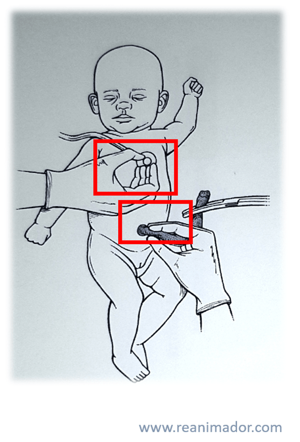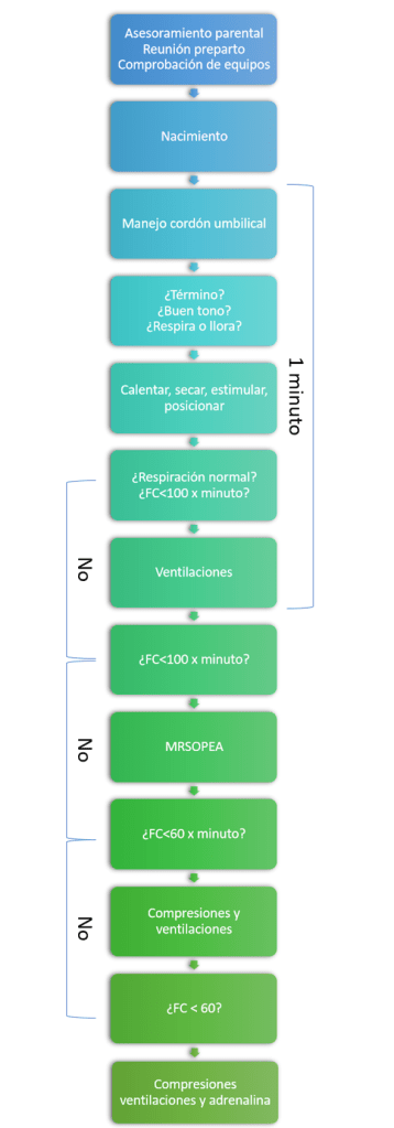 Al igual que en niños y adultos, existe un diagrama de reanimación neonatal completamente distinto a los anteriores, el diagrama consta de ciclos de 30 segundos, donde lo primero que haremos es preguntarnos si el paciente es de término, respira o llora y si tiene buen tono muscular, el cordón umbilical debe cortarse un minuto después del nacimiento y de ordeñarse previamente. Si la respuesta es sí, debemos entregar el bebé a su madre para iniciar la lactancia materna y el apego. Si la respuesta es no, debemos realizar los pasos iniciales, que consisten en despejar las vías respiratorias, secar, entregar calor y estimular, en muchos casos con eso es suficiente para iniciar una respiración normal y mejorar el tono muscular, si no es así nos preguntaremos si respira o no y si su frecuencia cardíaca es menor a 100 latidos por minuto, si la respuesta a esas preguntas es si, debe realizar 30 segundos de ventilación a presión positiva y conectar un sensor de saturación parcial de oxígeno, si la respuesta es no, debe preguntarse si la respiración es dificultosa, de ser así debe iniciar ventilación a presión positiva de igual manera. Una vez completados los 30 segundos de ventilaciones observaremos nuevamente la frecuencia cardíaca, si esta es menor a 100 latidos por minuto, deberá implementar los pasos correctivos de la ventilación, que veremos más adelante, y ventilar durante 30 segundos adicionales. Una vez asegurada una ventilación efectiva durante al menos 30 segundos, observaremos la frecuencia cardíaca nuevamente, si esta se encuentra entre 60 y 100, repetiremos los pasos correctivos y las ventilaciones, mientras que si es menor a 60 latidos por minuto agregaremos compresiones torácicas en el tercio inferior del esternón, evitando comprimir el apófisis xifoides, pues las compresiones a ese nivel o inferior se asocian en casi el 100% de los casos a desgarros hepáticos. Las compresiones deben entregarse en ciclos de 3 por 1 ventilación durante 30 segundos. Finalmente, de persistir la frecuencia cardíaca bajo 60 latidos por minuto, debe sumar el uso de adrenalina endovenosa. Menos del 1% de los casos llegan a este nivel.