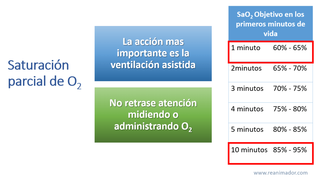 Es muy importante destacar que la acción más importante en la reanimación neonatal es la ventilación efectiva y que la SaO2 debe orientar el uso de oxígeno suplementario, por lo tanto, jamás debe retrasar la reanimación por administrarlo o medir o medir su saturación parcial. Al nacimiento el neonato posee un SaO2 entre el 60 y el 65% y alcanza valores normales para un lactante recién a los 10 minutos, el uso de oxígeno suplementario puede elevar estos valores normales antes de los 10 minutos, y eso puede cerrar prematuramente las comunicaciones arteriovenosas, lo que puede empeorar la condición del paciente, de lo anterior se deduce que la suplementación de oxígeno debe ser dirigida por la saturometría parcial de oxígeno.