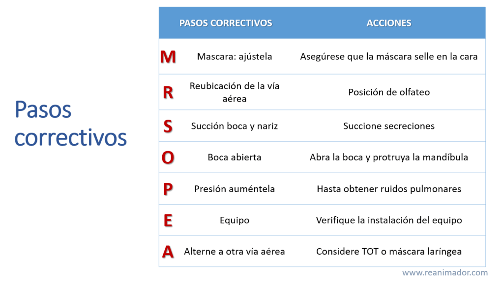 Recuerde que las compresiones deben iniciarse solo si la frecuencia cardíaca es bajo 60 latidos por minuto a pesar de una ventilación adecuada. Si las ventilaciones no logran expansión torácica debemos corregir esa situación, para eso usamos la herramienta MR SOPEA. La M corresponde a mascarilla, asegúrese que la mascarilla tenga un selle adecuado, la R, de reubicación de la vía aérea, indica que hay que llevarla a posición de olfateo, la S hace referencia succionar la boca y la nariz, la O de open, señala que hay que abrir la boca del paciente, la P, de presión, se refiere a que presione un poco más la bolsa de reanimación, la E de equipo, indica que hay que verificar que este cense de manera correcta y la A, de alternar la vía aérea, señala la posible necesidad de instalar un dispositivo avanzado de vía aérea.