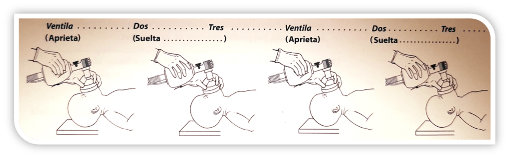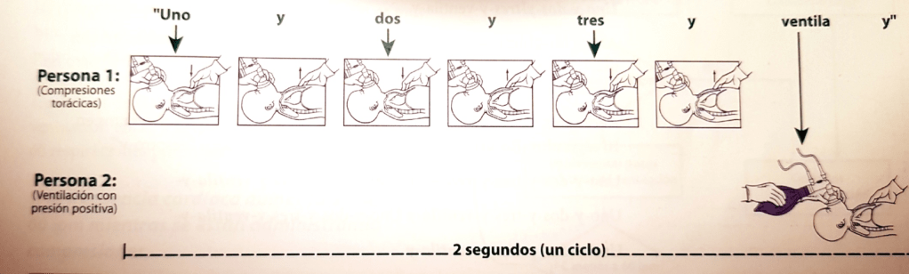 Para administrar ventilación a presión positiva debe tener en consideración que es posible que necesite más reanimadores, por lo tanto, solicitar ayuda es una acción fundamental. La mascarilla neonatal es siempre más pequeña que las pediátricas, además, a diferencia de las de otros rangos etarios, son redondas. Recuerde que el recién nacido proviene de un medio acuático, por lo que es importante asegurarse que la vía aérea esté despejada y que la cabeza esté en posición de olfateo, ya que al estar en supino los neonatos y lactantes tienden a ocluir la vía aérea. Como en todas las edades, en el neonato es importante sellar de manera adecuada la mascarilla contra la cara del paciente con la técnica de la C y la E y comprimir la bolsa hasta lograr una adecuada expansión torácica, esta maniobra debe realizarse entre 40 a 60 veces por minuto, realizando una ventilación cada 2 a 3 segundos al igual que en niños, para esto se debe contar hasta 3, presionará la bolsa en 1 segundo y se soltará durante los siguientes dos, como se ve en la imagen.