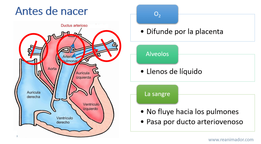 Para comprender la reanimación neonatal y sus diferencias con el soporte vital en lactantes, niños y adultos, primero debemos entender algunas cosas que ocurren antes de nacer y al momento del parto. Durante el embarazo el oxígeno fluye hacia el feto a través de la placenta y el cordón umbilical, no pasa por los alveolos, ya que estos se encuentran llenos de líquido amniótico y es impulsado a todo el cuerpo por el corazón, para que esto ocurra existen comunicaciones interventriculares y arteriovenosas.