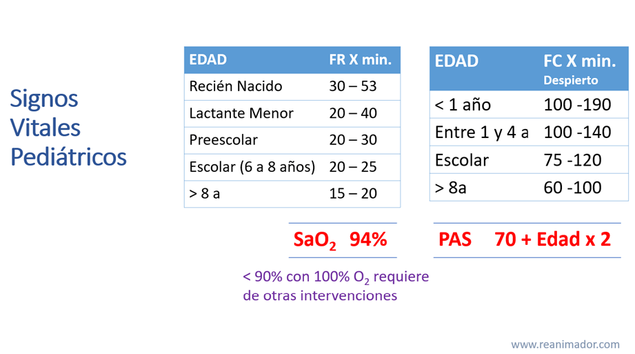 Recordemos que los signos vitales normales son distintos a distintas edades, estabilizándose parcialmente recién al alcanzar la pubertad. La frecuencia respiratoria normal va disminuyendo al avanzar la edad, así un recién nacido posee normalmente frecuencias respiratorias entre las 30 y 53 ventilaciones por minuto y a los 8 años estas fluctúan entre las 15 y 20 respiraciones por minuto. Los pacientes pediátricos son particularmente sensibles a la bradipnea y cuando esta se asocia a enfermedad grave el paro cardiorrespiratorio es inminente. La saturación de oxígeno en estos pacientes debe ser siempre superior a 94%, cuando es menor a 90% a pesar de suministrar una fracción inspirada de oxígeno de 100% con una máscara de no reinhalación, es indicador de la necesidad de usar dispositivos avanzados para la vía aérea. Al igual que la frecuencia respiratoria, la cardíaca disminuye con la edad, siendo normal entre 100 y 190 latidos por minuto en recién nacidos y en niños de 8 años la normalidad es igual que en adultos, entre 60 y 100 latidos por minuto. La presión arterial sistólica límite, bajo la cual se define al pediátrico como hipotenso es determinada por la fórmula 70 más la edad multiplicado por 2.