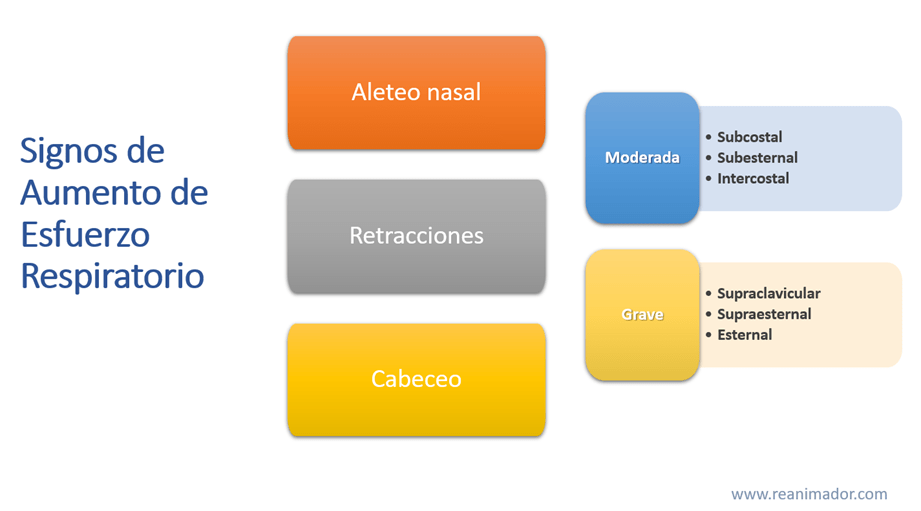 La evaluación del aparato respiratorio en niños cobra vital importancia, ya que ellos son particularmente lábiles en ese aspecto, para medir el aumento del esfuerzo respiratorio observaremos, el uso de musculatura respiratoria accesoria, que se evidencia en la presencia de retracciones, la insuficiencia respiratoria moderada genera retracciones subcostales, subesternales e intercostales, la insuficiencia grave genera retracciones supraclaviculares, esternal y supraesternal. Otros signos de insuficiencia respiratoria evidentes en niños, sobre todo en lactantes son el aleteo nasal y el cabeceo.