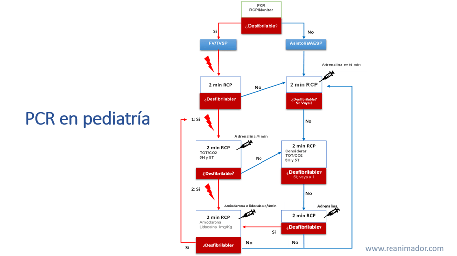 Las primeras acciones luego de confirmar el paro cardiorrespiratorio consisten en iniciar reanimación cardiopulmonar de alta calidad, conectar un monitor cardíaco y determinar si el ritmo cardíaco es desfibrilable. Si el ritmo es desfibrilable, es decir fibrilación ventricular o taquicardia ventricular sin pulso, el paciente debe recibir una desfibrilación precoz con 2 Julios por Kilo de peso corporal. Inmediatamente después de realizada la descarga en equipo iniciará un ciclo de dos minutos de maniobras de reanimación cardiopulmonar de alta calidad, y mientras eso ocurre el encargado del suministro de fármacos obtendrá un acceso vascular o intra óseo. Transcurridos los dos minutos de RCP se detendrán las maniobras para verificar el ritmo cardíaco, si este nuevamente es desfibrilable se administrará una nueva descarga con 4 julios por kilo de peso corporal y se iniciará un nuevo ciclo de 2 minutos de RCP de alta calidad. Durante el segundo ciclo el encargado de fármacos suministrará 0,01 miligramo de adrenalina por kilogramo. Repetirá la dosis ciclo por medio. Al finalizar este ciclo de reanimación se verificará nuevamente el ritmo cardíaco, si este es desfibrilable se realizará una descarga con más de 4 y menos de 10 julios por kilo de peso, se reiniciarán las maniobras de RCP y administrará 5 miligramos por kilo de peso de amiodarona mientras realizan las compresiones torácicas. Si el ritmo no es desfibrilable en cualquiera de las revisiones, se debe pasar al lado derecho del algoritmo, para tratar la asistolía y la actividad eléctrica sin pulso, en ese caso se debe priorizar el suministro precoz de adrenalina y las maniobras de reanimación cardiopulmonar de alta calidad, debe evaluar el ritmo cada 2 minutos y suministrar dicho fármaco cada 4 minutos o ciclo por medio. Recuerde pesquisar las causas reversibles y realizar una anamnesis con la herramienta SAMPLE dentro de lo posible.