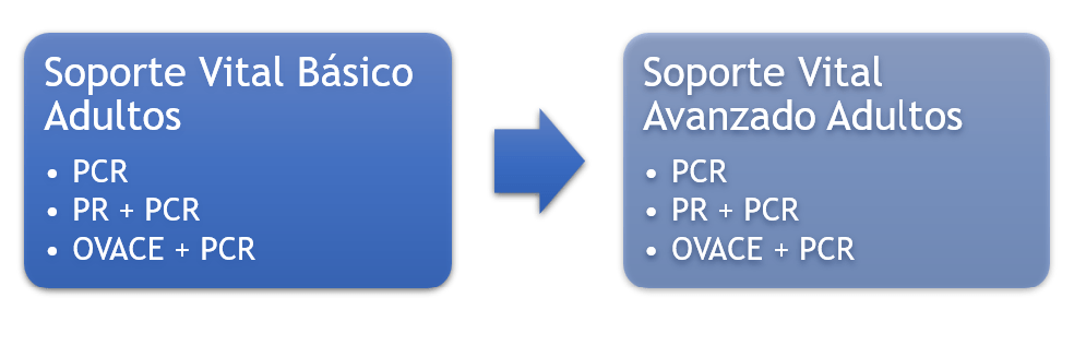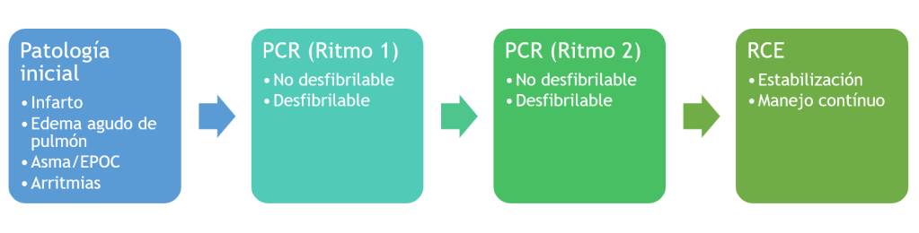 La prueba comienza con una del las patologías indicadas en el cuadro 1, que evoluciona a PCR. Durante el PCR el paciente puede cursar con ritmos desfibrilables o no desfibrilables y evolucionarán favorablemente a retorno a circulación espontánea donde deben pasar por las fases de estabilización y manejo continuo.