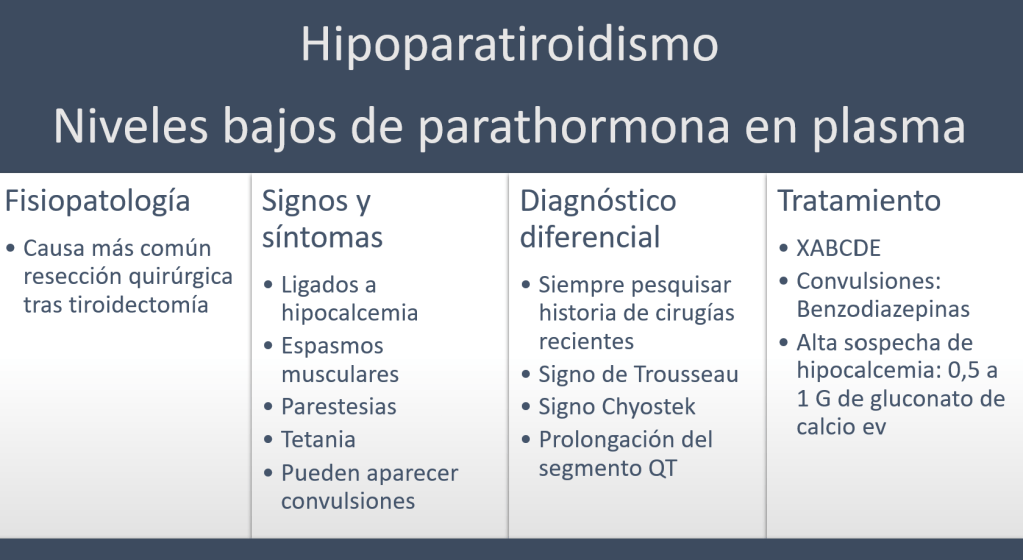 Como a lo a largo de todo el manual, en el hipoparatiroidismo debemos respetar la secuencia XABCDE para solucionar afecciones posiblemente mortales, por ejemplo, la obstrucción de la vía aérea por compromiso de conciencia o el shock.