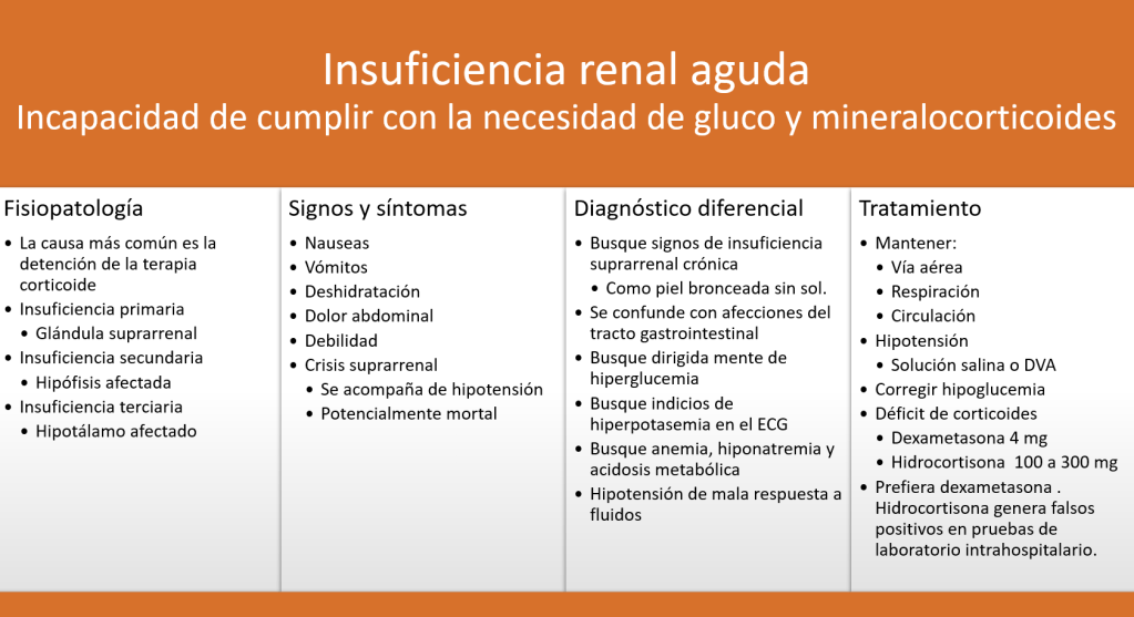 La insuficiencia renal aguda se define como la incapacidad de la medula suprarrenal de responder a las necesidades de gluco y mineralocorticoides del organismo. La causa más común es la detención de la terapia corticoide.